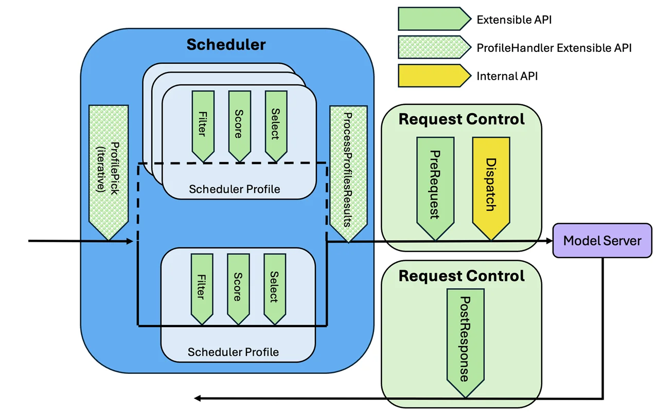 • Scoring: Assign each remaining pod a score via extensible scorers - evaluating factors like queue depth, session affinity, prefix cache hits, and custom SLO indicators.