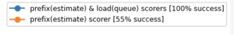 Both scorers achieve 100% success rate across the full load range, confirming that load balancing alone is sufficient when prefix reuse is low.